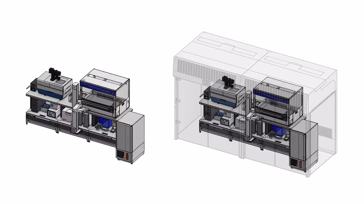 3D visualization of the work-cell highlighting key components for automated, high content imaging complete with biosafety enclosure.