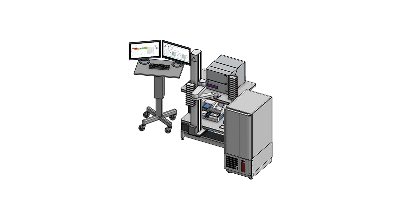 3D visualization of the cell based assay work-cell highlighting key components for automated, high-throughput screening.