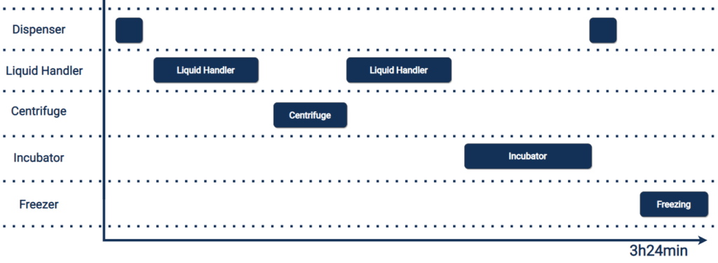 This was the approach we took with a recent client, who, for legal reasons, we’ll refer to as ‘Super Cool Biotech’ (SCB for short). SCB was able to turn an almost 6-hour cell culture process into a 70-minute one by parallelising their processes, taking processes off deck and better connecting their equipment.